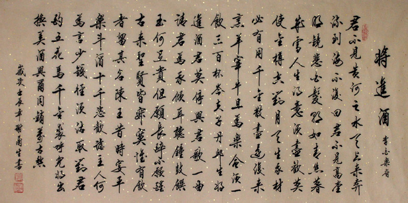 第二句“君不見高堂明鏡悲白發(fā),朝如青絲暮成雪。” 這句話用了排比來呼應(yīng)第1句,意思要表達(dá)人生苦短,時(shí)光匆匆,兄弟們,喝吧,你看早上照鏡子還是一頭黑發(fā),晚上就變白了。 前兩句又是時(shí)光不會(huì)倒流,又是人生苦短,開篇立意一起,目的就是要你喝酒,而且要及時(shí)喝酒。不得不說李白勸酒,勸出了高水平。 接著他又說“人生得意須盡歡,莫使金樽空對(duì)月?!钡靡獾臅r(shí)候要盡情的歡樂,喝吧喝吧,別讓壇中美酒白白放在那里了。前三句,只字不提酒,句句讓你喝。 “烹羊宰牛且為樂,會(huì)須一飲三百杯?!薄皶?huì)須”就是必須,一定要的意思。這句話一定要把“烹”字和“宰”以及“三”字發(fā)重音,重重的大聲讀出來,就像咱們喝酒劃拳一樣,才能讀出李白當(dāng)時(shí)的心情。這句話意思是你要么不喝,要喝酒喝三百杯,當(dāng)然咱們中國(guó)詩(shī)詞里的數(shù)字都喜歡用夸張手法。不過這氣勢(shì)當(dāng)時(shí)就嚇壞了在座的兩位朋友。 “岑夫子,丹丘生,將進(jìn)酒,杯莫停!”岑夫子就是岑勛,丹丘生叫元丹秋,都是李白的好兄弟,好朋友,這兩位一聽完上一句就趕緊把酒杯放下,真喝不了了,剛放下酒杯就被點(diǎn)名,你可以腦補(bǔ)一下李白一手拿酒,一手指著這兩位的畫面,你這兩個(gè)家伙,杯子端起來,快喝酒,不要停! “與君歌一曲,請(qǐng)君為我傾耳聽?!边@又是大家熟悉的環(huán)節(jié)了,吹完牛皮,熊完不喝酒的人,接下來就是才藝表演環(huán)節(jié)了,誰(shuí)還沒經(jīng)歷過這種場(chǎng)面,那你一定是太年輕了。 接下來是他唱的歌?!扮姽酿傆癫蛔阗F,但愿長(zhǎng)醉不愿醒。”“鐘鼓饌玉”是代指功名富貴,說功利祿都不重要,都沒用,我只想喝醉。 “古來圣賢皆寂寞,惟有飲者留其名。”從古至今的圣賢,死了之后就籍籍無名了,沒有人記得了,“寂寞”了,只有喝酒的人的名字才會(huì)被人記得,兄弟們,你要想永垂不朽流芳百世,就跟我一起喝酒吧! 這時(shí)候就已經(jīng)喝嗨了,開始說歪理,講胡話了。 “主人何為言少錢,徑須沽取對(duì)君酌?!痹趺磿?huì)沒錢呢?現(xiàn)在談什么錢呢?沒勁!只管喝酒! “五花馬。千金裘,呼兒將出換美酒。”這里的“兒”可能是他的兒子,也可能指侍童。李白說:“小子,去把我的馬,我的袍子拿去當(dāng)了!給老子換酒來!”看來他是真的沒錢了,也印證了前面那句“千金散盡還復(fù)來”是吹牛的。 “與爾同銷萬(wàn)古愁”,充滿了感情 色彩,也是這首勸酒歌流傳百世的點(diǎn)睛之筆